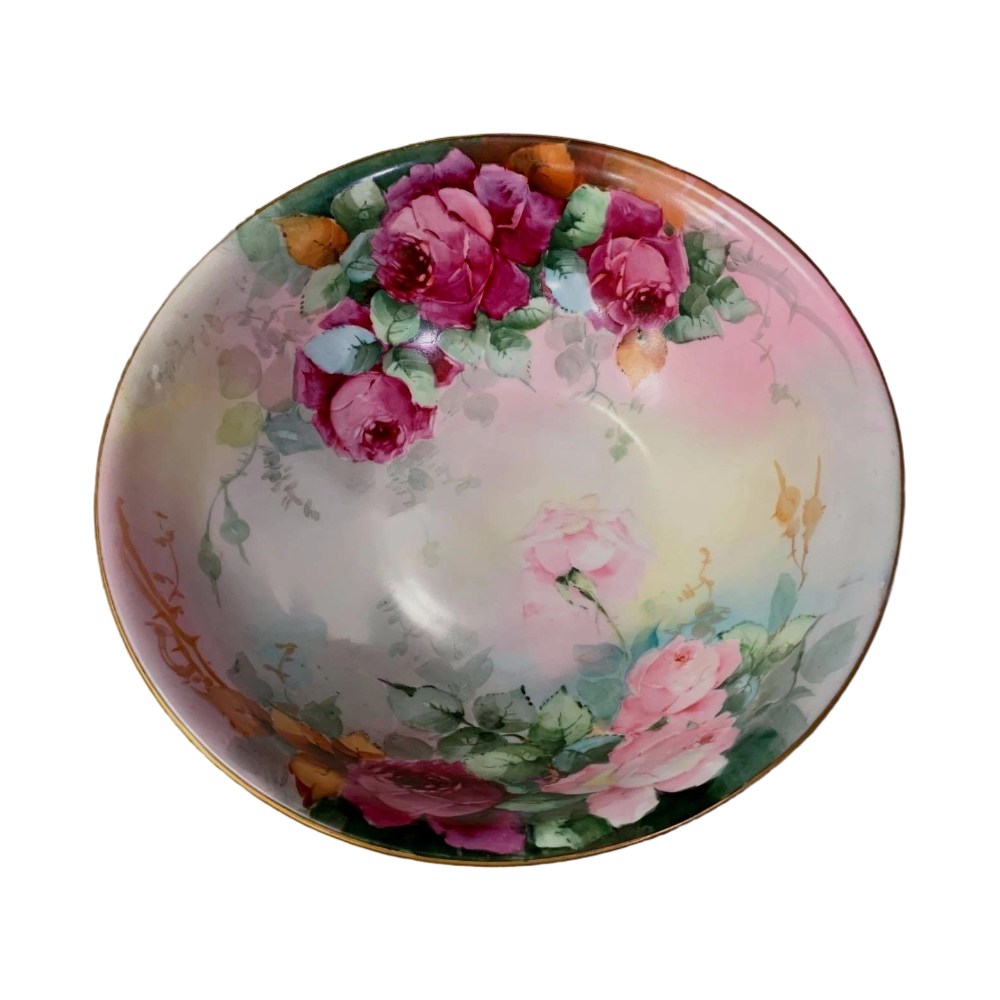 This luxurious hand-painted porcelain bowl is a true masterpiece of craftsmanship, featuring a vibrant floral motif with deep magenta roses and soft blush tones. Delicately brushed by hand, the fine artwork blends gently into the pastel background, creating a dreamy, almost ethereal effect. The rim is adorned with elegant gold detailing that highlights the bowl’s nostalgic charm and timeless sophistication.