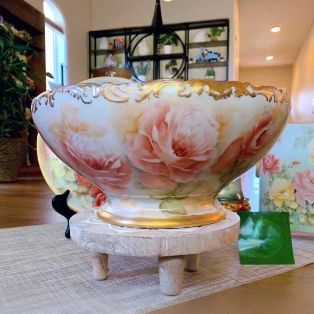 Handbemalte Porzellanschale mit Rosen in Blushtönen und goldenen Akzenten